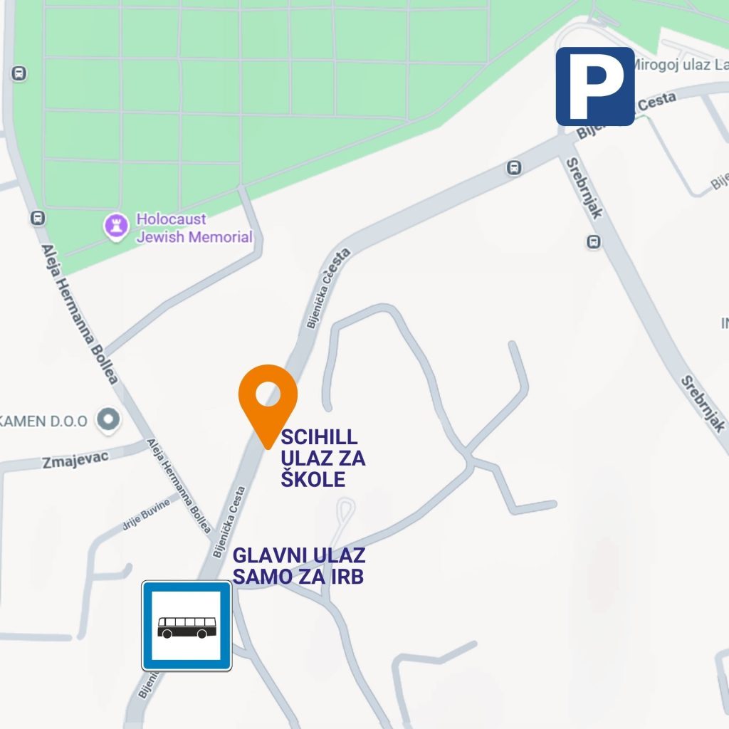 - Ako dolazite autobusom, preporučujemo iskrcavanje učenika i parkiranje autobusa na parkiralištu groblja Mirogoj, kod ulice Srebrnjak.